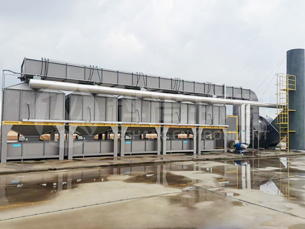 噴漆房廢氣收集→氣旋混合噴淋塔→多級(jí)活性炭吸附設(shè)備一離心風(fēng)機(jī)→15米煙囪高空排放。